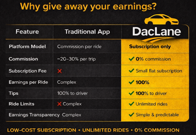 DacLane is redefining ride-sharing by putting control back where it belongs—in the hands of drivers and riders. Drivers keep 100% of their earnings and enjoy the freedom of a flexible, subscription-based model, while riders benefit from fair, transparent pricingand more affordable rides.By removing high commissions and focusing onfairness, DacLane creates a better balance—drivers earn more, and riders payless. With the ability to choose trusted drivers, every ride becomes safer,more personal, and more reliable. DacLane isn’t just another ride app—it’s asmarter, fairer way to move.